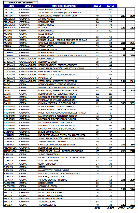 Se non interverranno grandi modifiche nella demografia cremonese, questo comporterà nel breve periodo, ovvero fino al 2030, una diminuzione degli studenti in tutti gli ordini scolastici.