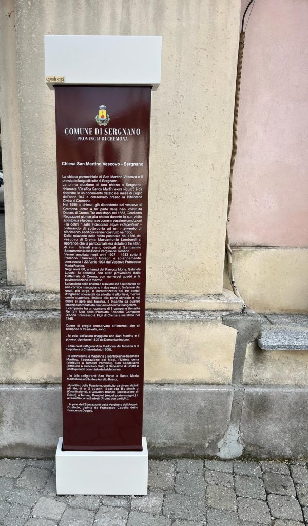 Il Comune di Sergnano, in collaborazione con la parrocchia San Martino Vescovo di Sergnano, ha posato alcuni “totem” con informazioni di carattere storico, artistico e culturale di fronte ai principali edifici civili e religiosi del paese.