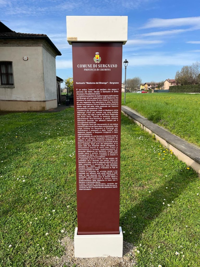 L’assessore alla cultura Paola Basco commenta così l’iniziativa: “Cogliendo anche l’occasione del Giubileo, che vede il nostro Santuario del Binengo indicato come “chiesa giubilare” della Diocesi di Crema, l’amministrazione comunale ha deciso di valorizzare il patrimonio artistico e i beni culturali presenti a Sergnano. In questo modo i cittadini e gli eventuali turisti potranno consultare, direttamente davanti al palazzo comunale e alle chiese del paese, le principali informazioni storiche, artistiche e architettoniche degli edifici e delle opere in essi contenuti”.