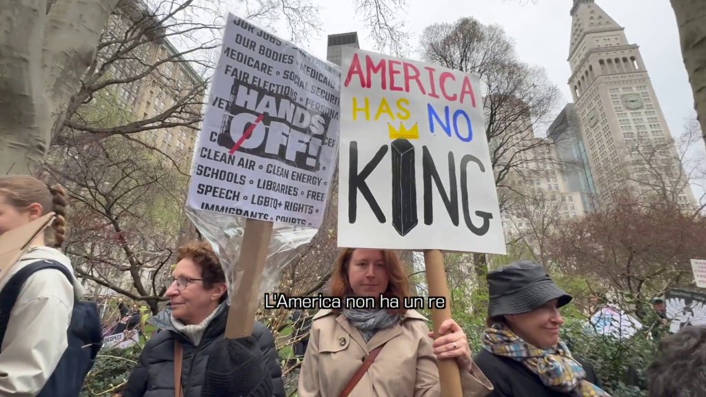 NEW YORK (STATI UNITI) (ITALPRESS) – Sabato pomeriggio, nel cuore di Manhattan, la Broadway tra Bryant Park fino a Madison Square Park, è diventata il palcoscenico di una delle tante manifestazioni che hanno infiammato gli Stati Uniti in questo weekend di protesta. Migliaia di cittadini, cartelli alzati e voce ferma, si sono riuniti per dire basta a Trump: “Giù le mani da tutto”, ha gridato una manifestante davanti alla telecamera. “Dalla scienza, dai nostri corpi, dalla democrazia”. Il video che abbiamo girato documenta in presa diretta le voci e i volti di chi ha deciso di scendere in piazza per difendere i diritti civili, lo stato di diritto, la solidarietà internazionale e, soprattutto, la Costituzione americana. Tra i tanti slogan, una manifestante ha un cartello già utilizzato nel 2017: “L’America non ha un re”. L’atmosfera è carica e determinata. C’è paura, sì, ma anche lucidità e un manifestante “travestito” da presidente Lincoln dice che “non è più una questione di destra o sinistra: è una questione di giusto o sbagliato” e su come difendere la democrazia, il manifestante sosia del presidente che abolì la schiavitù e vinse la guerra civile, non ha dubbi: “Votate, votate, votate!”. Al centro della rabbia degli americani – le manifestazioni con lo slogan “Hands Off” si sono tenute in tutti e cinquanta stati degli Stati UNiti – le ultime mosse del presidente Donald Trump e del suo principale “consigliere” Elon Musk: sotto tiro le minacce percepite verso l’integrità democratica degli USA. “Abbiamo un governo fascista”, afferma una manifestante, ricordando che gli italiani sanno di cosa si tratta e facendo eco alle preoccupazioni di molti. Nel video, la protesta newyorkese si trasforma in un mosaico corale dove giovani e meno giovani, americani e cittadini del mondo, si uniscono in un grido che va oltre le linee partitiche: “Il mondo deve svegliarsi. Perché una casa divisa non può reggere”. Con riferimenti alla difesa dell’Ucraina contro Putin, a non ripetere le storie tragiche e dittatoriali di paesi sudamericani come il Cile, l’Argentina e il Brasile, i partecipanti dimostrano che la lotta per la democrazia non conosce confini. E alla fine una manifestante si lancia in difesa del Canada attaccato da Trump. Nel video, le interviste raccolte da Italpress durante la manifestazione a New York con le voci e le emozioni degli americani che non vogliono una deriva autoritaria.