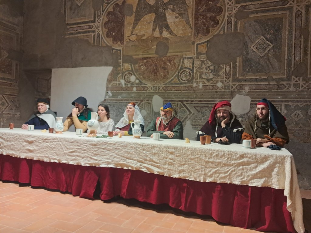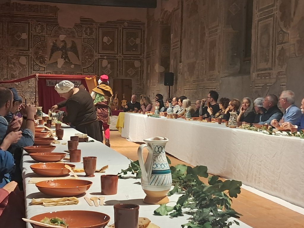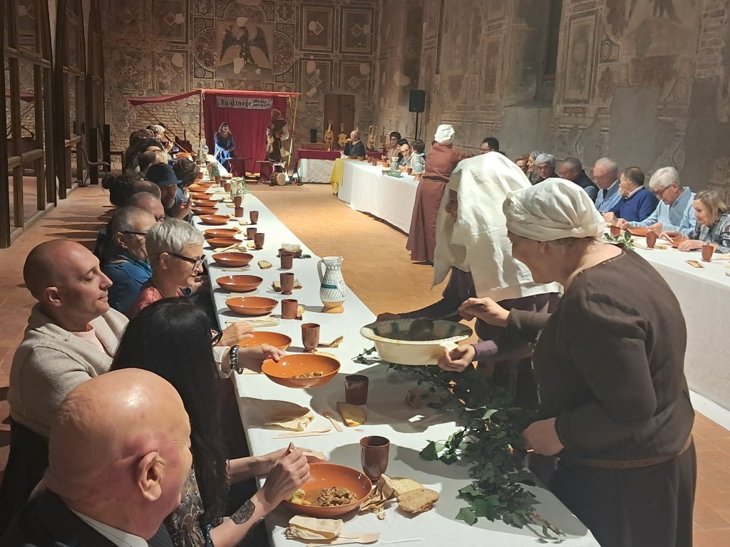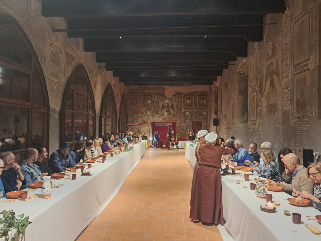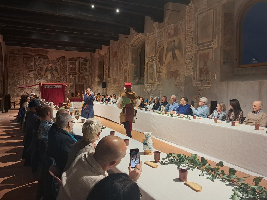 La serata è stata impreziosita anche dalla presenza di abiti legati al periodo medievale lombardo, dai rappresentanti dell’Associazione Civitas Viscontea di Pagazzano, di Maximiliam Montrone, presidente della Confraternita il Dragone, oltre che dagli interventi di Vittore Melleri, che ha descritto le diverse portate: Insalata con del pane nero, poi zuppa di fagioli con la carne di maiale, a seguire delle particolari lasagne, ma non come le conosciamo noi oggi, senza pomodoro, perché all’epoca non era stata ancora scoperta l’America, quindi il brodetto saracenico, una zuppa agrodolce a base di pollo, mele pere, prugne secche e altro, la casciata, una torta salata di formaggio, e per finire una torta in balconata, fatta di tre strati di pasta frolla intervallati con crema alle mandorle, datteri freschi e frutta secca, accompagnata con l’ippocrasso, un vino speziato tipico delle corti medievali, detto anche Nettare degli dei.