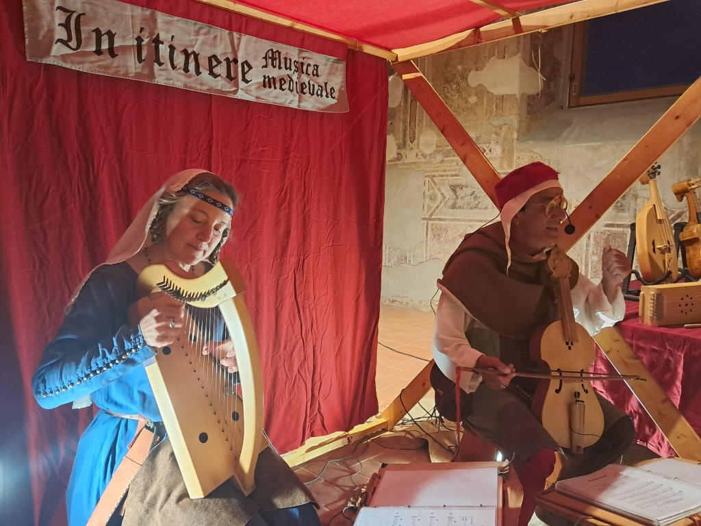 A descrivere l’idea che sta alla base della manifestazione, Margarita Moron, presidente della Proloco pandinese che dal suo insediamento ha inteso puntare a sviluppare un percorso di studio e approfondimento dell’epoca medievale, all’interno del quale si inseriscono eventi come quello di ieri, curato nei minimi particolari anche nella definizione del menù della cena medievale, accompagnata dalla musica del duo In Itinere musica medievale, con la musicologa Chiara Mojana e il polistrumentista Bertino Chiari: tra strumenti musicali di liuteria storica ispirati alle testimonianze iconografiche, quali quelli ad arco come la lira, la viella, la ribeca, a pizzico, come l’arpa, a fiato come il flauto, o a percussione, come il tamburo, i sonagli o il triangolo, l’ensemble In Itinere ha colto nel segno, trasmettendo la gioia e l’immediatezza delle sonorità medievali, all’epoca eseguiti soprattutto nelle strade, nelle corti e nei luoghi di pellegrinaggi.
