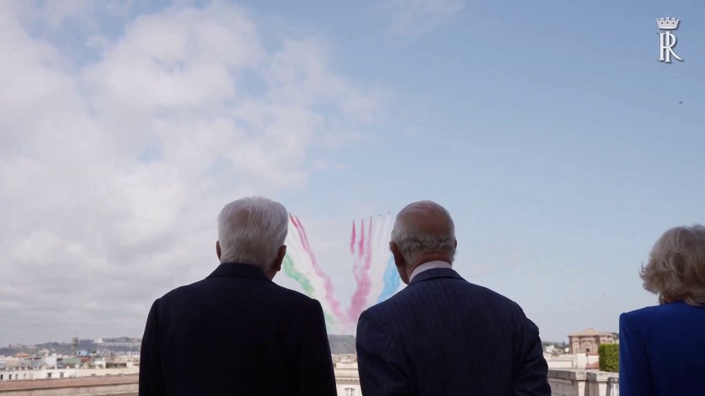 ROMA (ITALPRESS) – Nel video del Quirinale il sorvolo della Pattuglia Acrobatica Nazionale (le Frecce Tricolori) e delle Red Arrows britanniche in occasione della visita di Stato dei Reali Carlo III e Camilla a Roma, con l’incontro al Colle con il presidente della Repubblica Sergio Mattarella.