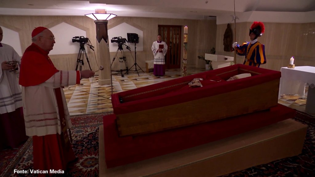 ROMA (ITALPRESS) – Il Vaticano ha diffuso un filmato tratto dal rito della Constatazione della morte e della deposizione della salma nella bara, che si è tenuto lunedì sera secondo l’Ordo Exsequiarum Romani Pontificis, in seguito alla morte di Papa Francesco. A presiederlo il cardinale Kevin Joseph Farrell, Camerlengo di Santa Romana Chiesa.