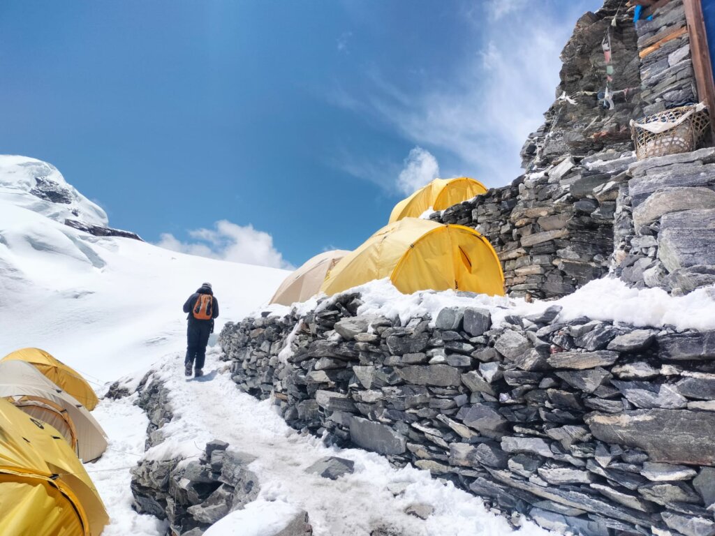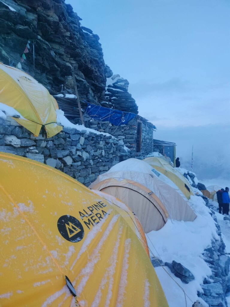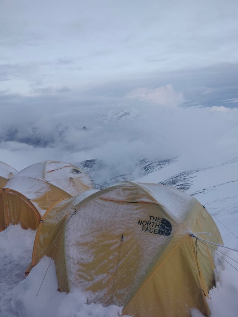 Quanto al meteo, oltre a qualche giornata di neve, Ruffoni racconta di un cielo un po’ nuvoloso, anche se in quota, “quando spunta il sole, ci si scalda tanto, l’aria è secchissima e anche se piove e tutto asciutto dopo poco”. Tuttavia questa situazione ha mitigato le temperature minime, perché “se c’è tanto sole di giorno, poi la notte fa molto freddo, invece il cielo nuvoloso fa da cuscinetto, ed in effetti in cima la temperatura è stata di –18, lontana dai -35 patiti in Russia, su altre montagne”.