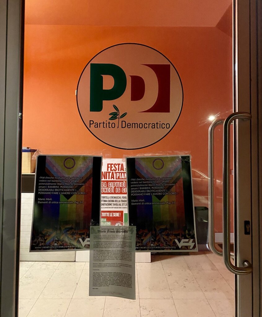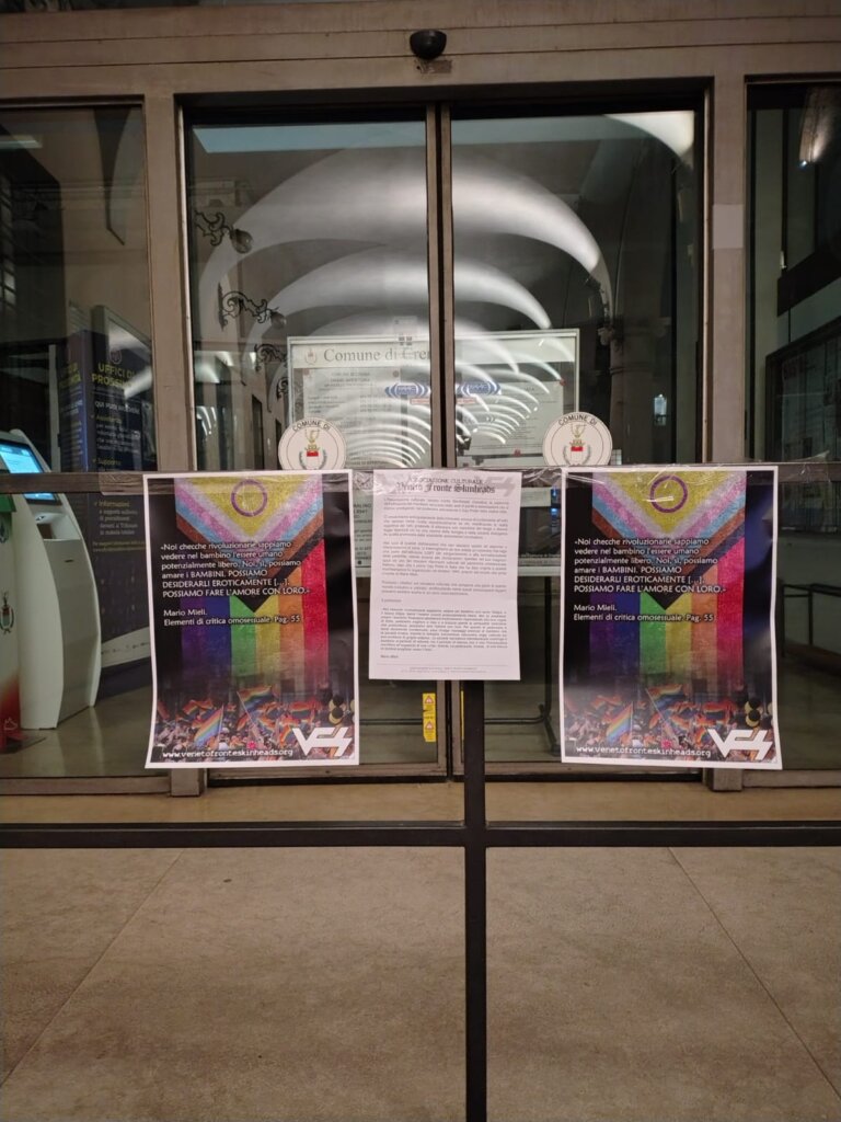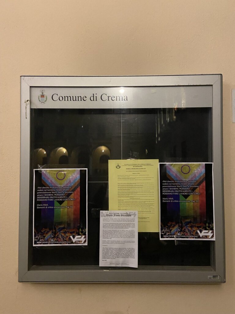 Nella notte a Crema sono apparsi alcuni manifesti contro il Crema Pride. A rivendicarne l’origine un’associazione legata all’estrema destra. I cartelli sono apparsi all’esterno del Palazzo Comunale, sulla porta d’ingresso della sede del Partito Democratico, all’esterno del Bar Parko, sulla saracinesca della sede di Rifondazione Comunista e sul portone della Camera del Lavoro.