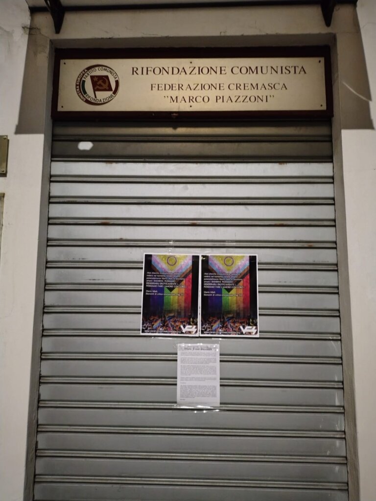 Agiscono di notte come vuole la tradizione fascista. Ma non è tradizione è gesto codardo, si firmano ma non si fanno vedere. Usano parole di altri, estrapolando frasi di scrittori e persone per bene ma a loro uso e consumo. Questi gesti rappresentano un attacco diretto non solo alla comunità LGBTQIA+, ma ai valori fondamentali di inclusione e rispetto che la nostra società deve promuovere. Esprimiamo come Federazione di Cremona del Partito della Rifondazione Comunista la nostra più profonda solidarietà al comitato organizzatore del Crema Pride, al nostro circolo “Peppino Impastato” di Crema, alla CGIL, al Partito Democratico, al Bar Parko, ai Comuni di Crema e Casaletto Vaprio, alle associazioni coinvolte e a tutte le persone che si riconoscono nei valori di uguaglianza e libertà. Il Crema Pride, in programma per il 24 maggio 2025, è un evento storico per la città: la sua prima manifestazione di orgoglio LGBTQIA+, sostenuta dal Comune di Crema e dalla Provincia di Cremona.