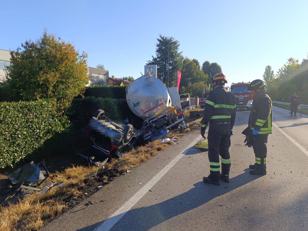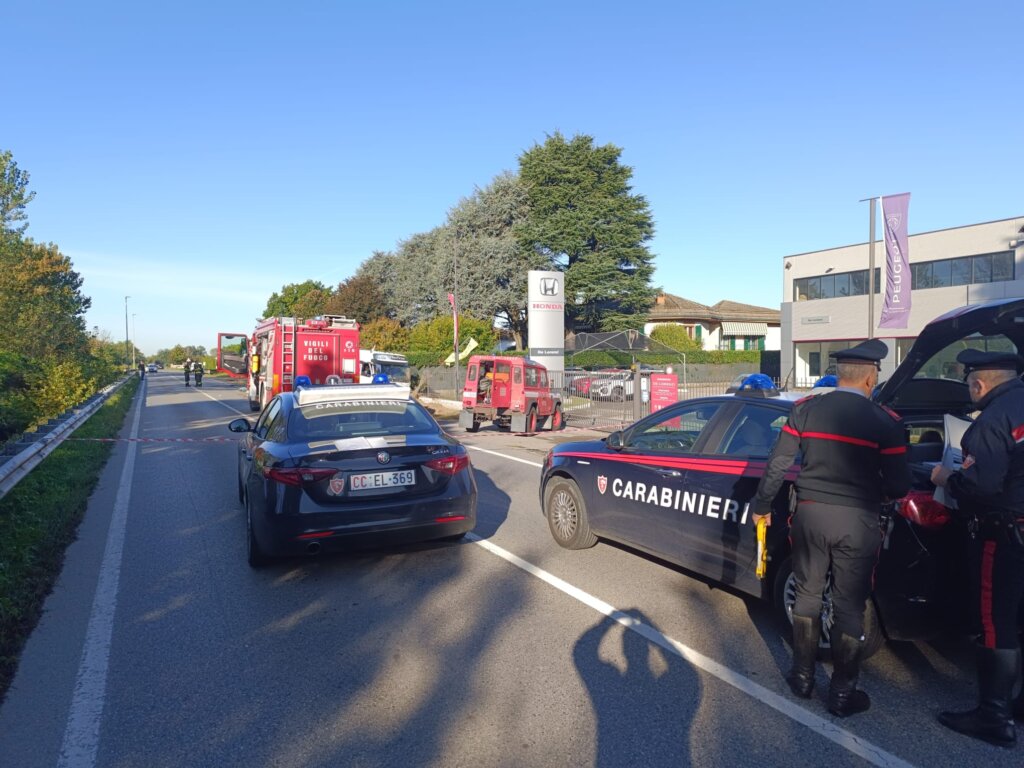 Domenica di sangue sulle strade cremasche, a causa di un incidente avvenuto poco prima delle 8 sulla statale 235 a Bagnolo Cremasco, all’altezza della concessionaria Honda. Un camion adibito a trasporto di liquidi alimentari, condotto da un 48enne della provincia di Lodi in viaggio verso Crema, si è scontrato con una Citroen C4 alla cui guida si trovava un uomo di 51 anni di Crespiatica (Lodi) che percorreva la strada in senso opposto. Un urto frontale violentissimo, il camion ha praticamente trascinato l’utilitaria nel fosso, schiacciandola, finendo poi la corsa contro la recinzione del concessionario. Nulla da fare per il 51enne, morto sul colpo. Per soccorrerlo, era stata allertata anche l’eliambulanza partita da Milano, che purtroppo non è servita.