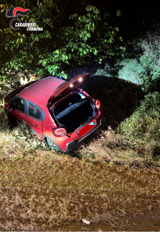 Il veicolo, dopo diversi chilometri, è uscito ad altissima velocità verso Vaiano e ha imboccato la SP 71 verso Monte Cremasco. Alla rotatoria di via Canale Vacchelli l’auto è andata fuori strada, finendo nel fossato a lato della carreggiata.