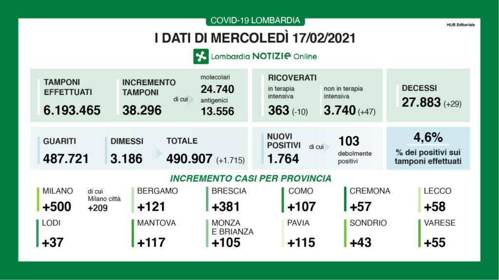 Cronaca 17 Feb 2021 Covid, 57 casi in provincia. In regione giù di 10 le terapie intensive, indice contagio 4,6%