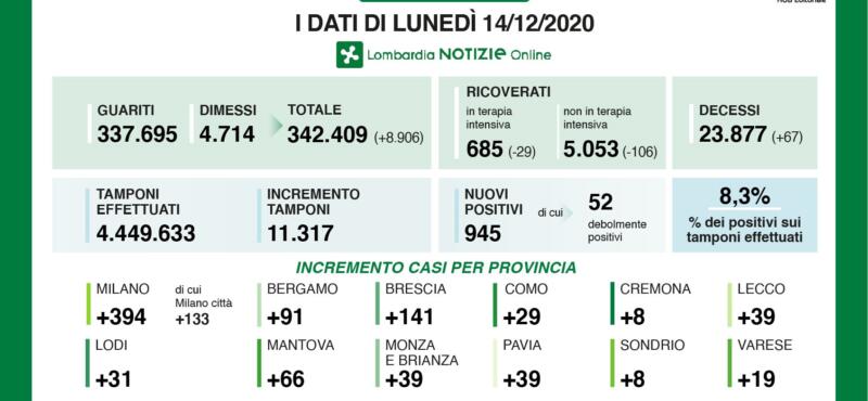 Cronaca 14 Dic 2020 Covid, in provincia di Cremona 8 nuovi casi, 945 in Lombardia Pochi tamponi e 67 decessi